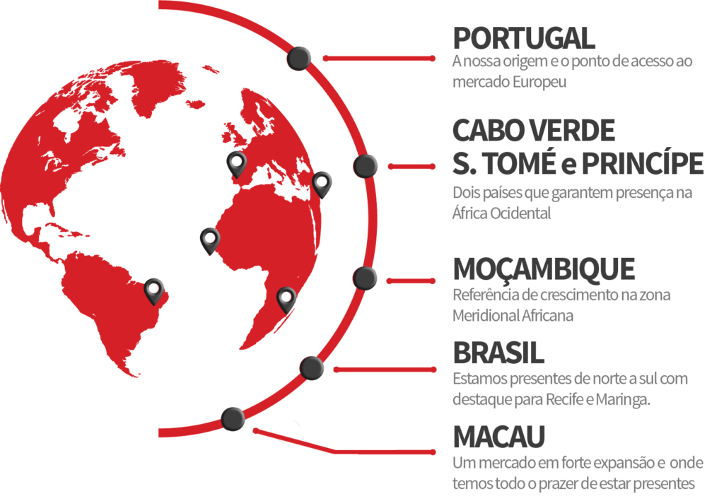 Europa e PALOP: Tomando como ponto de partida a nossa origem em Águeda, centro de excelência indústrial e de exportação, o nosso alcance extende-se para o mercado europeu e africano. Espanha, França, Itália e Alemanha são mercados naturais para qualquer cidadão Europeu, nós fazemos a ponte para os países africanos usando como ponto de entrada mercados que bem conhecemos como Cabo Verde, Moçambique e São Tomé e Princípe. O que nos une não é uma mera necessidade mas a confiança.